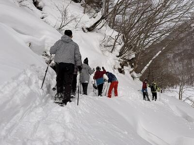 スノーシューでは、谷川岳一ノ倉沢コースを歩き、谷川岳の雄大な自然を感じることができ、雪山の厳しさや美しさを経験することができました。