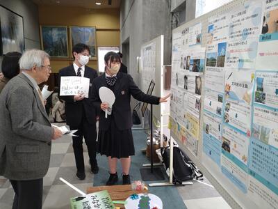 また、本校生徒2学年普通科の生徒5名が、「みなかみふるさと創生学」の授業の一環として、運営のお手伝いとポスター発表を行いました。ポスター発表では、「文学班」としての1年間の取り組み(みなかみ町と若山牧水を始めとする文豪との関係を踏まえつつ、「利根商版まるごと短歌」を実施することで、新たな魅力を創生し観光資源とする探究活動)や自分たちが作成した短歌について、表彰式参加者に向けて紹介しました。歌人の伊藤一彦先生・吉川宏志先生・小島なお先生を始め、様々な方々が興味を示して下さり、生徒たちにとっても大きな自信となりました。